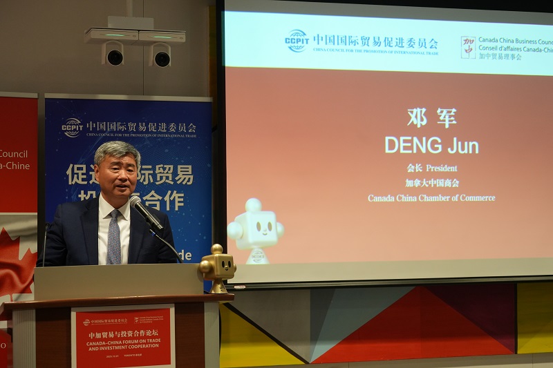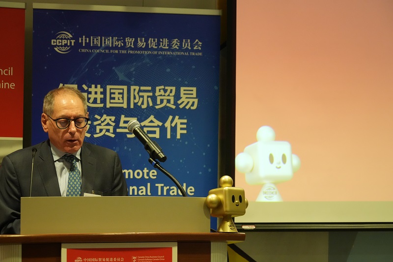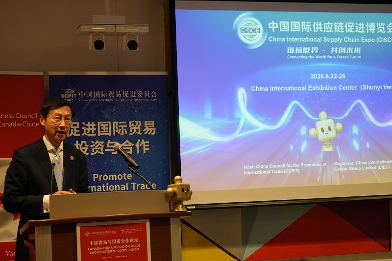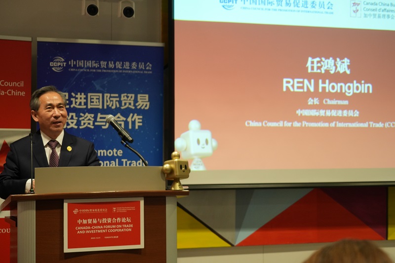 任鸿斌在致辞中表示,今年是中国与加拿大建交55周年和建立战略伙伴关系20周年。双方领导人在韩国庆州的会晤为推动双边关系改善与发展提供了战略指引。中国贸促会愿与加方相关机构深化合作,为中加经贸关系的健康稳定发展提供支持,并推动双方企业在贸易、投资等领域拓展合作。他指出,中方将重点促进清洁能源、汽车电子、科技创新等新兴产业合作,同时推动双方携手开拓第三方市场,加强产业链和供应链协同,并欢迎加拿大工商界积极参与2026年APEC中国年相关活动。