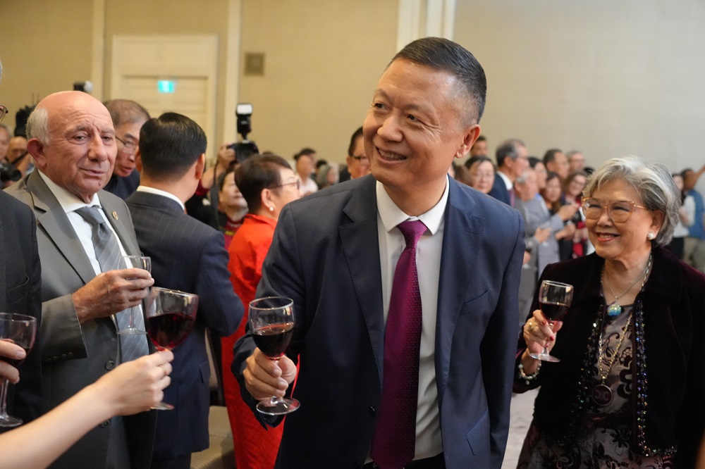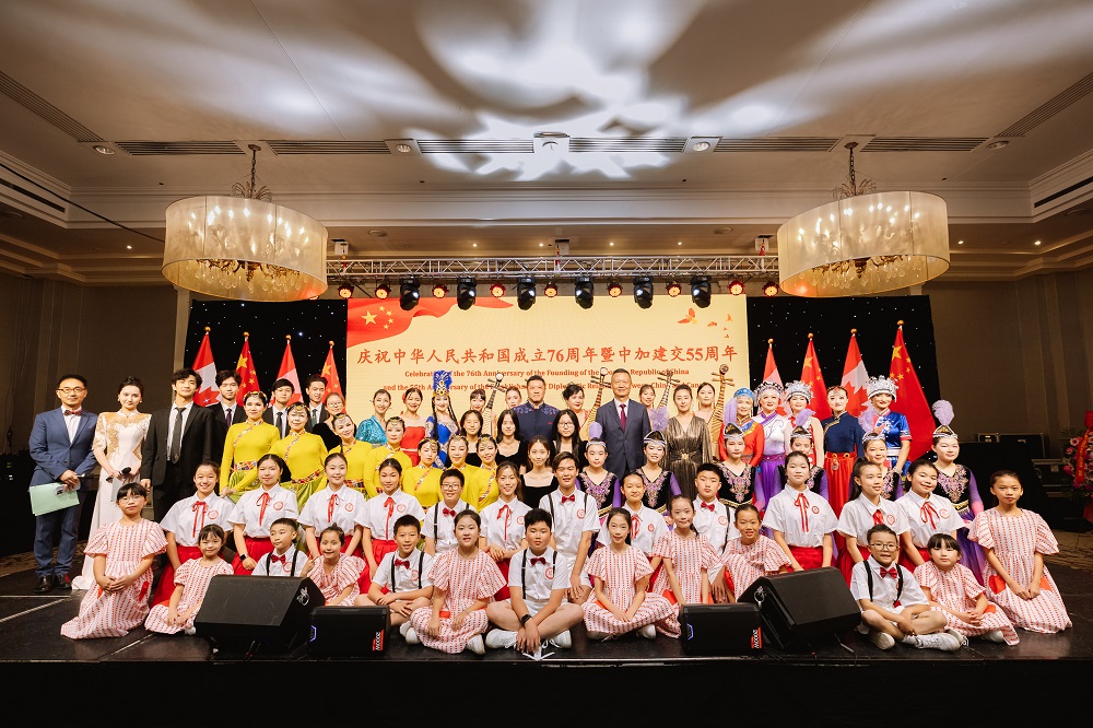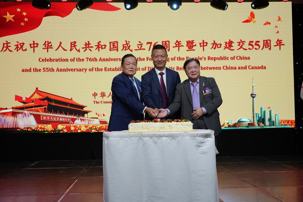 罗伟东最后提议全场举杯,为中华人民共和国成立76周年,为中加两国繁荣发展和人民友谊长存,为各位来宾身体健康、事业进步干杯。