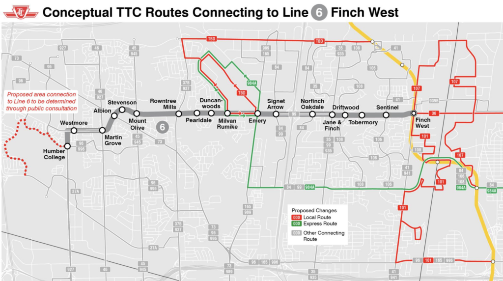 FinchWest轻轨采用零排放列车,每列车可容纳多达300名乘客,最高时速可达60公里。线路全长设有18个站点,沿FinchWest大道运行,连接Yong街—大学线(Line 1 Yonge-University)的FinchWest与亨伯理工学院北校区(Humber Polytechnic North Campus)。