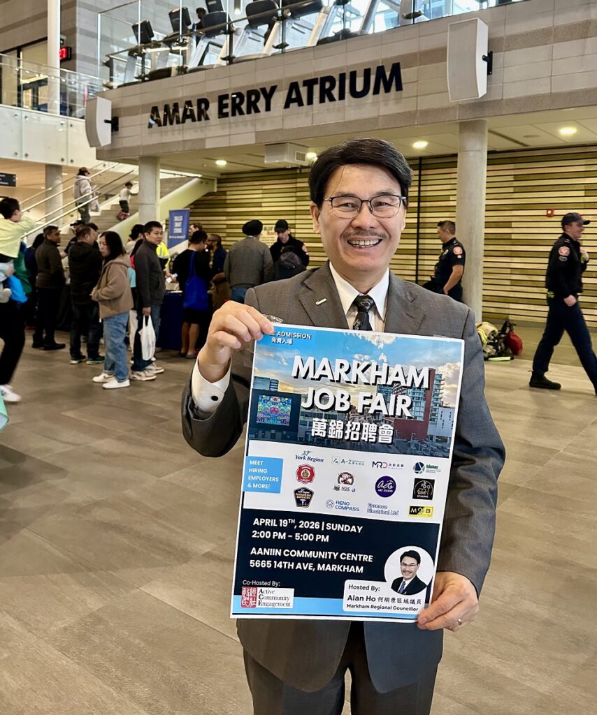 【加拿大视传媒报道】由万锦市区域议员何胡景(Regional Councillor Alan Ho)主办、Active Community Engagement(A.C.E.)政经民社协办的万锦招聘会(Markham Job Fair)4月19日在万锦市Markham的Aaniin Community Centre举行,吸引超过500名求职者及社区居民到场,与政府部门、公共机构及本地企业面对面交流就业信息。活动时间和地点与主办方此前发布的公开邀请一致。