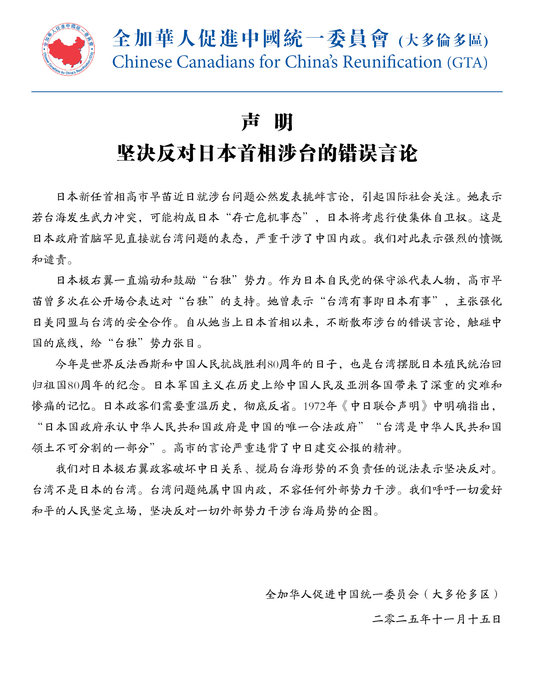 今年是世界反法西斯和中国人民抗战胜利80周年的日子,也是台湾摆脱日本殖民统治回归祖国80周年的纪念。日本军国主义在历史上给中国人民及亚洲各国带来了深重的灾难和惨痛的记忆。日本政客们需要重温历史,彻底反省。1972年《中日联合声明》中明确指出,“日本国政府承认中华人民共和国政府是中国的唯一合法政府”“台湾是中华人民共和国领土不可分割的一部分”。高市的言论严重违背了中日建交公报的精神。