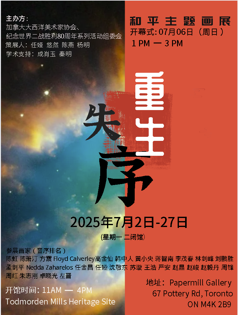 【加拿大视传媒 报道】为纪念世界反法西斯战争暨中国抗战胜利80周年,一场以“和平”为主题的国际画展《失序 & 重生》于2025年7月6日在多伦多Todmorden Mills Heritage Site的Papermill Gallery隆重开幕。该展览由世界反法西斯暨中国抗战胜利80周年系列活动组委会、大西洋文化艺术交流协会及大西洋美术家协会联合主办。
