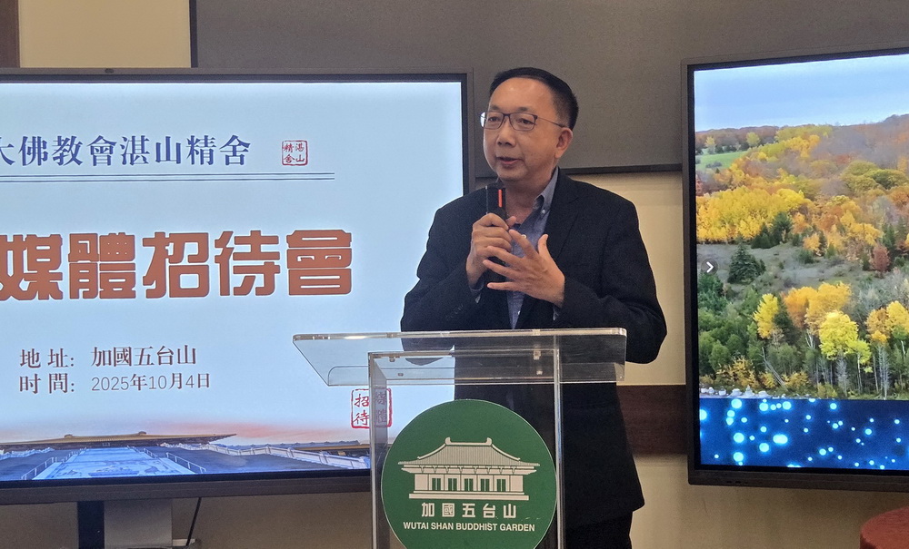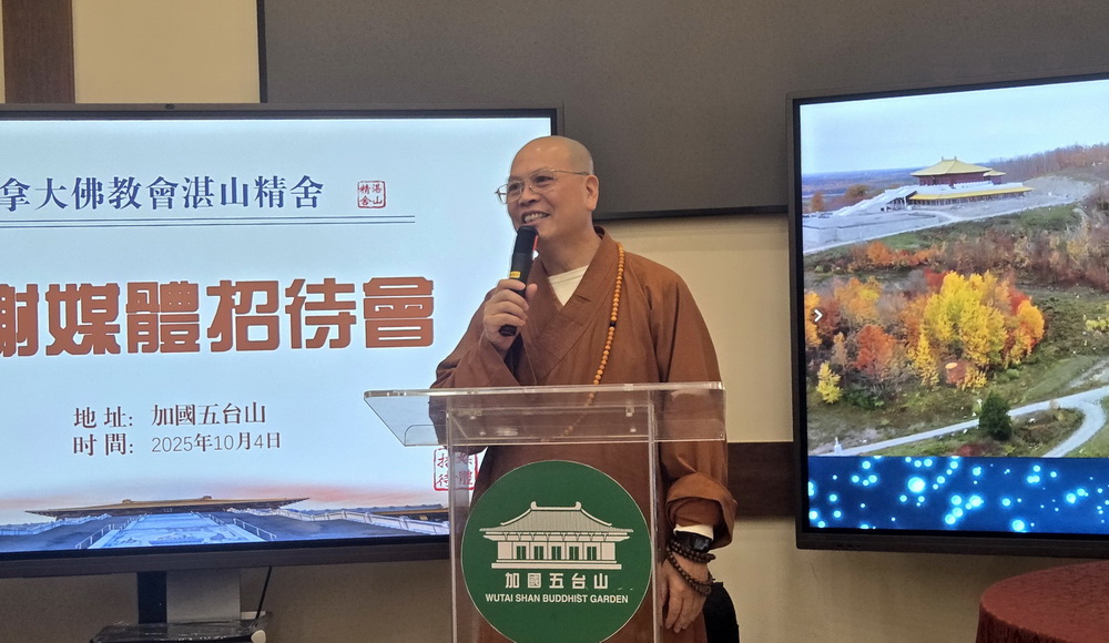 “各位媒体朋友,午安!感谢大家在中秋前夕,专程驱车一个多小时来到加国五台山,与我们共聚一堂。”加国五台山达义大和尚在开场致辞中深情说道,“每年此时,我们都期盼与各位相见。你们不仅是五台山发展历程的记录者,更是我们前行路上重要的同行者。”他回顾了加国五台山从一片荒地至三殿巍峨的十九年历程,感慨道:“这一路上,有太多值得感恩的人与事——尤其是各位媒体朋友,用文字、影像与声音,让五台山的故事被更多人听见、看见。”