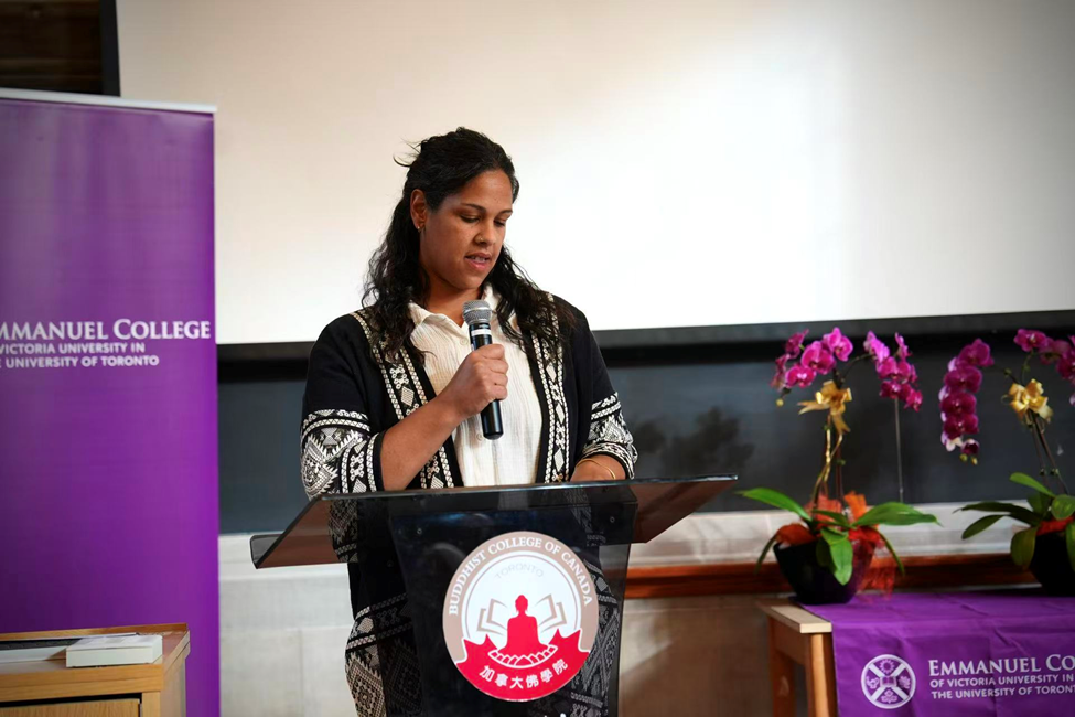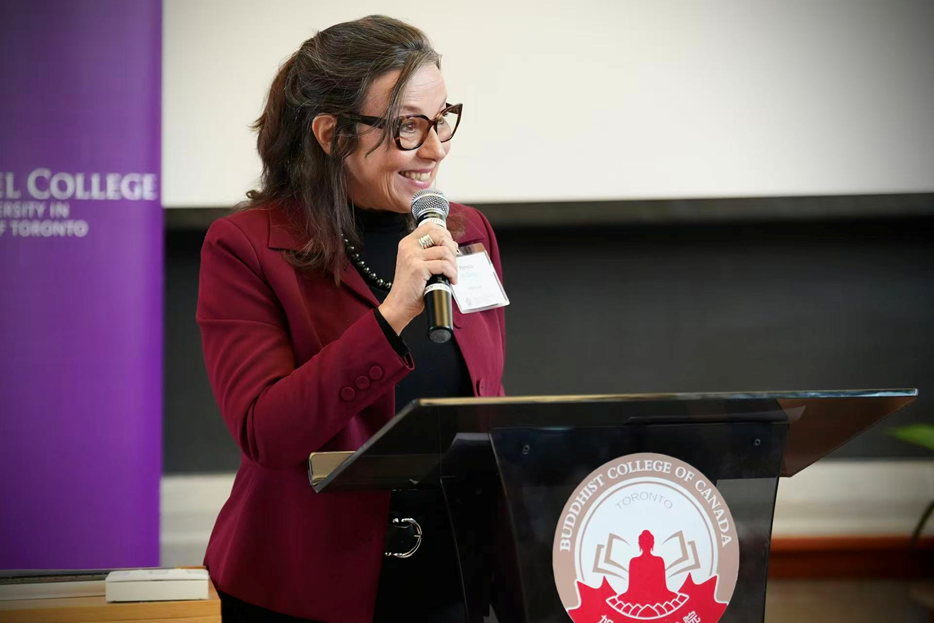 以马内利学院代校长 Pamela McCaroll 在致辞中指出,本课程充分展现“转化性的力量”。她赞扬敬业的师资团队,鼓励毕业生继续在以马内利学院深造,并对加拿大佛教会长期的支持与合作表达感谢。她笑言:“我真希望能与毕业生们一起回到课堂!”