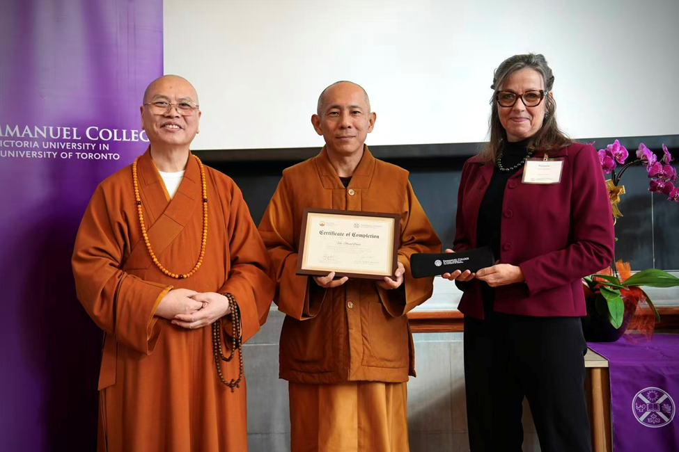 加拿大佛教会会长、加拿大佛学院校董会主席达义大和尚在致辞中代表学院向来宾与社会各界表达诚挚感谢。他表示:“今天,我们怀着感恩的心,在多伦多大学维多利亚大学以马内利学院的大礼堂,共同庆祝加拿大佛学院第二届毕业典礼,并见证双方在‘慈悲的伞盖’计划下不断深化的合作关系。这一合作以相互尊重与慈悲教育为共同目标,发展成果远超最初预期。以马内利学院以真诚与开放的态度接纳佛学,尊重我们的价值与传统。对此,我深表感谢,并向诸位教授与讲师致以由衷敬意。自2024年首届毕业典礼至今,我们见证了学生不断深化的正念与内在转化。愿你们将智慧带回社区,让生命散发慈悲之光。”