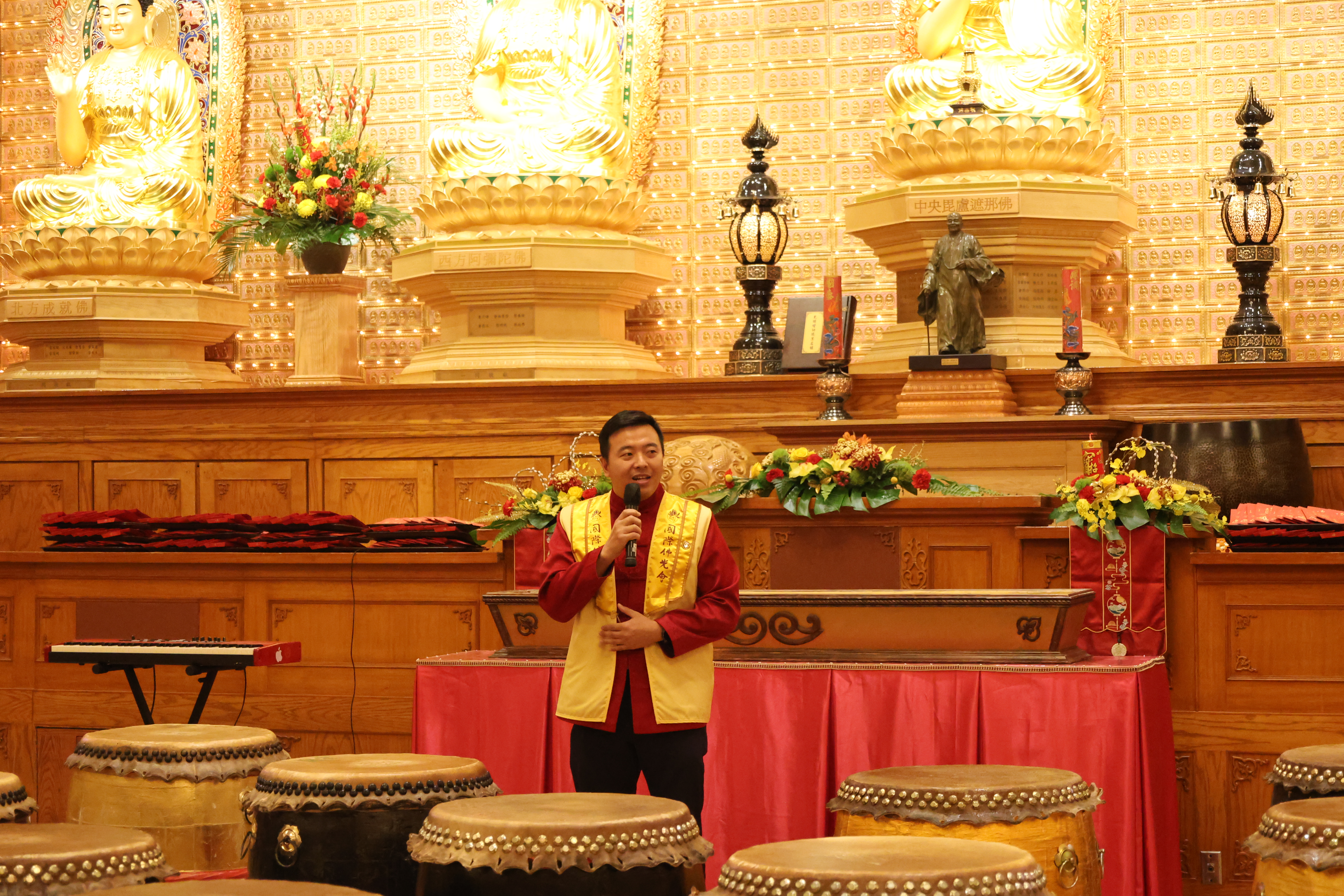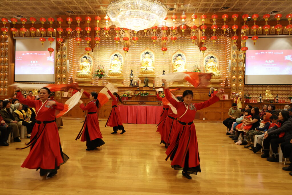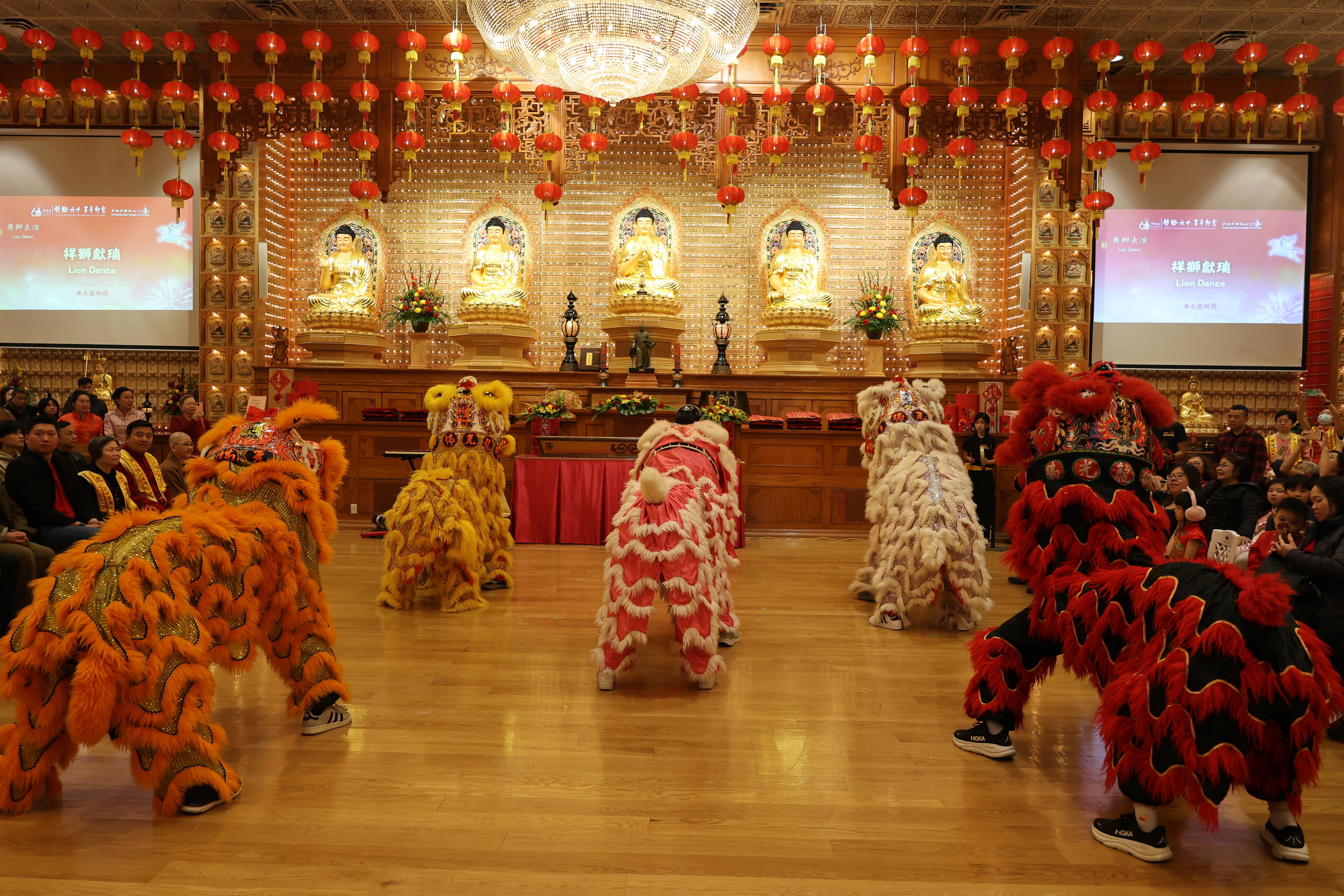 多伦多佛光龙狮团二十四节令鼓节目震撼开场,20余位从5岁到17岁的青少年铿锵有力、节奏分明,且配合默契,让大家为之惊喜。随后带来「祥狮献瑞」分别由幼小狮子和青少年大狮子表演,穿梭于大殿中央,为大众送上吉祥平安之祝福,年味十足。