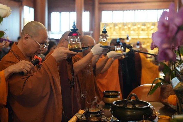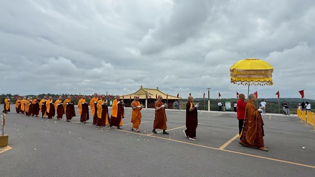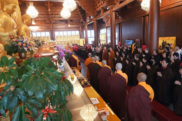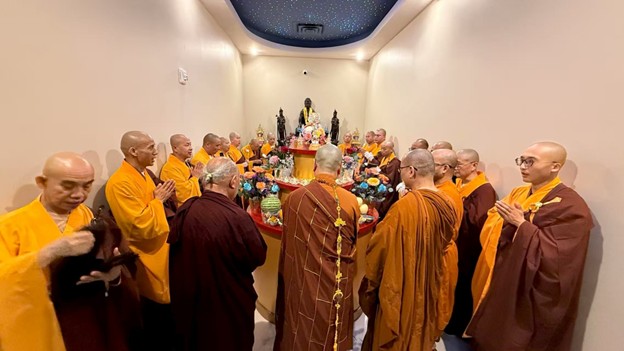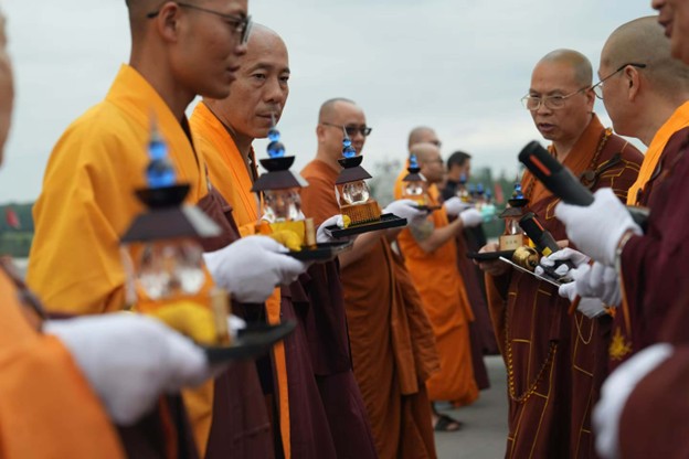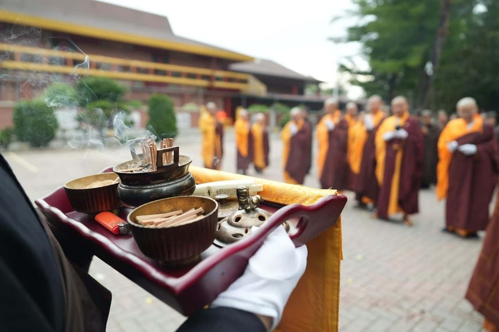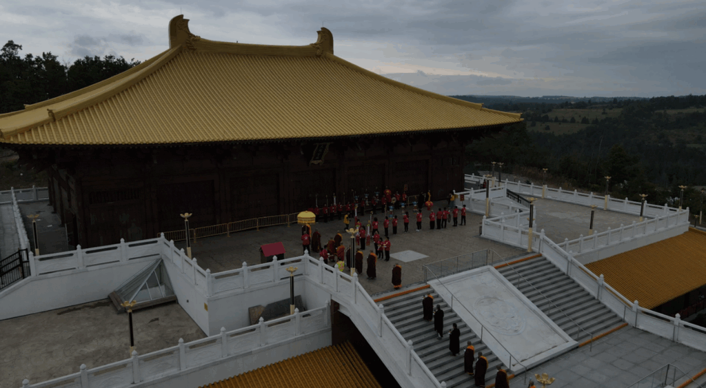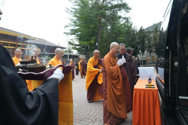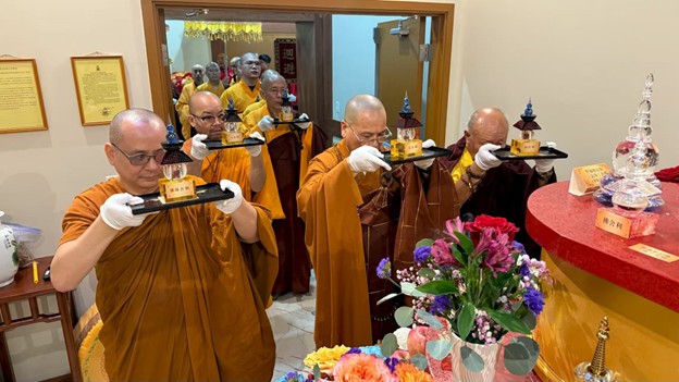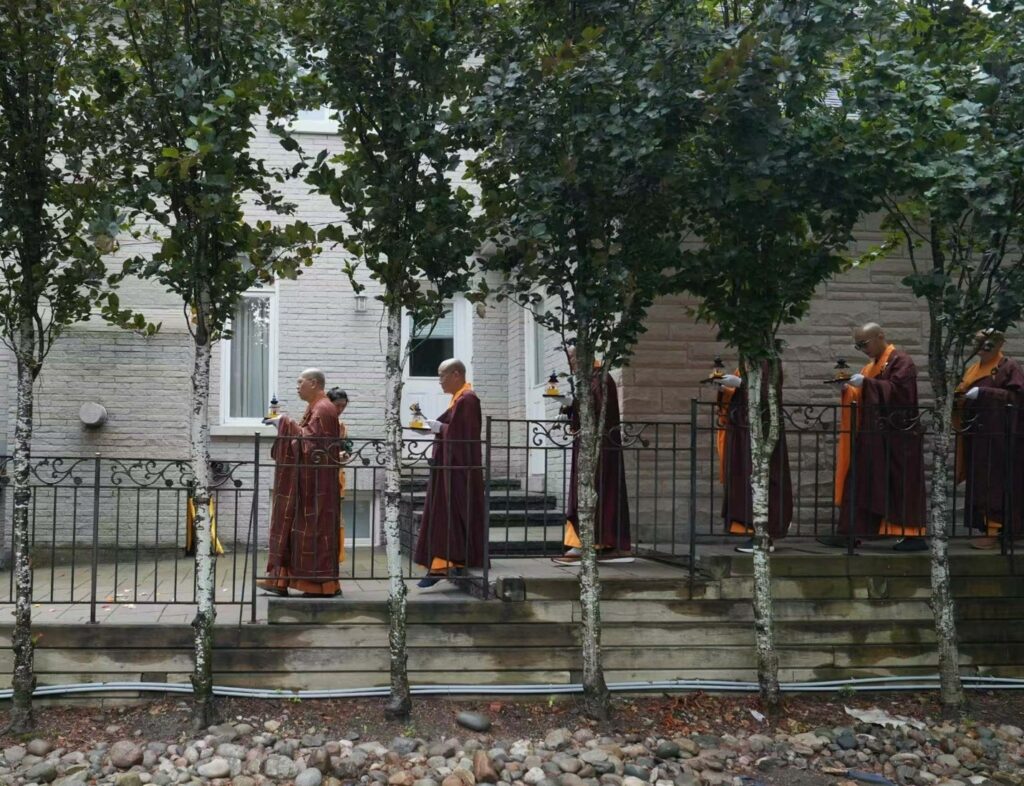 2025年8月17日清晨,加拿大佛教会会长、湛山精舍住持达义大和尚率领两序大众,于湛山精舍性空长老生前曾驻锡的寮舍,虔诚恭请长老舍利。香烟缭绕,众人顶礼合掌,心怀无尽的感恩与敬仰。上午十时,舍利迎至加拿大五台山,大雄宝殿前四众弟子齐集,举行庄严隆重的移交与安奉仪式。