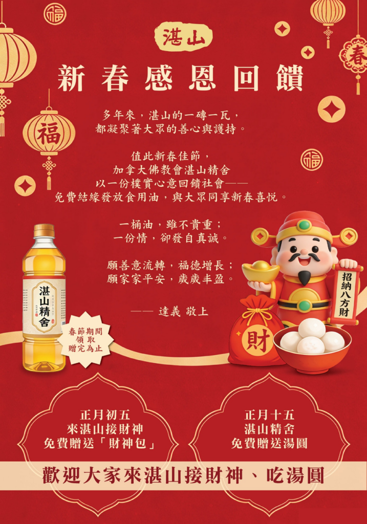 加拿大佛教会湛山精舍谨定于2026年2月21日(农历正月初五)迎财神、上财神大供。祈愿众善信开市大吉、财源广进、福气满满、幸福吉祥!