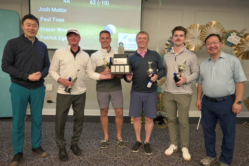 主辦方向「Chris Li慈善高爾夫球賽」頒發感謝狀感謝他們在賽事安排、招攬球手及贊助的貢獻。左起:頤康基金會總裁蕭顯揚、Chris Li、頤康創辦人及基金會主席王裕佳醫生、Momiji安老院聯合主席Ann Ashley女士。