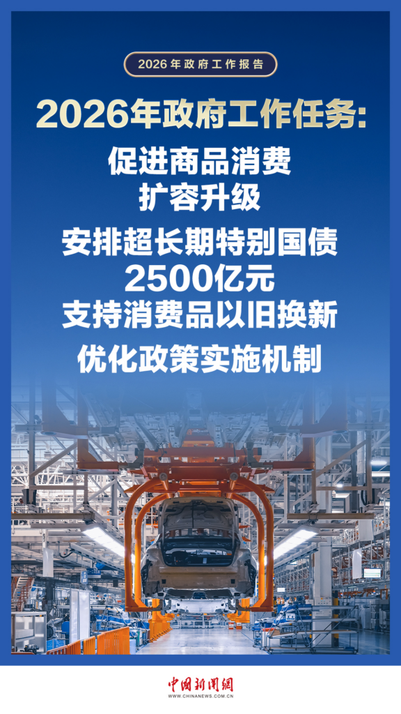 2026年政府工作任务:促进商品消费扩容升级,安排超长期特别国债2500亿元支持消费品以旧换新,优化政策实施机制。