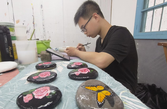在乌石艺术创意基地,青年画师正在石头上作画。