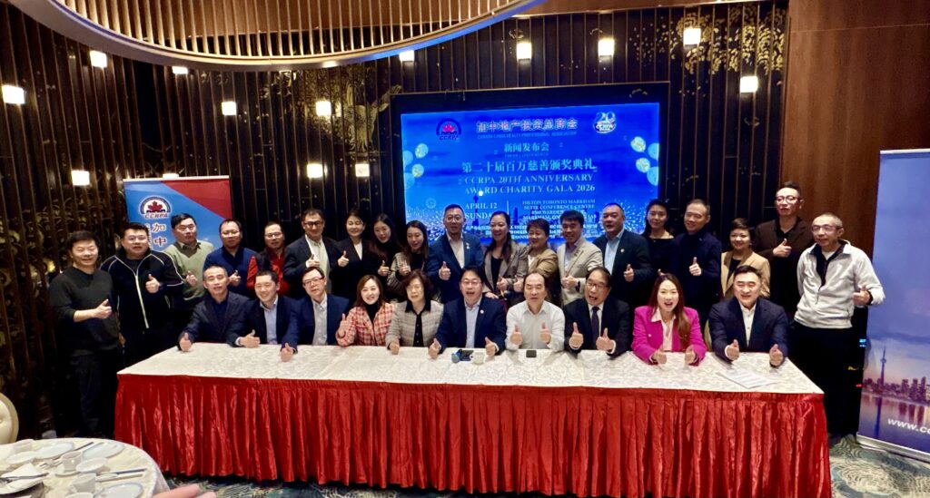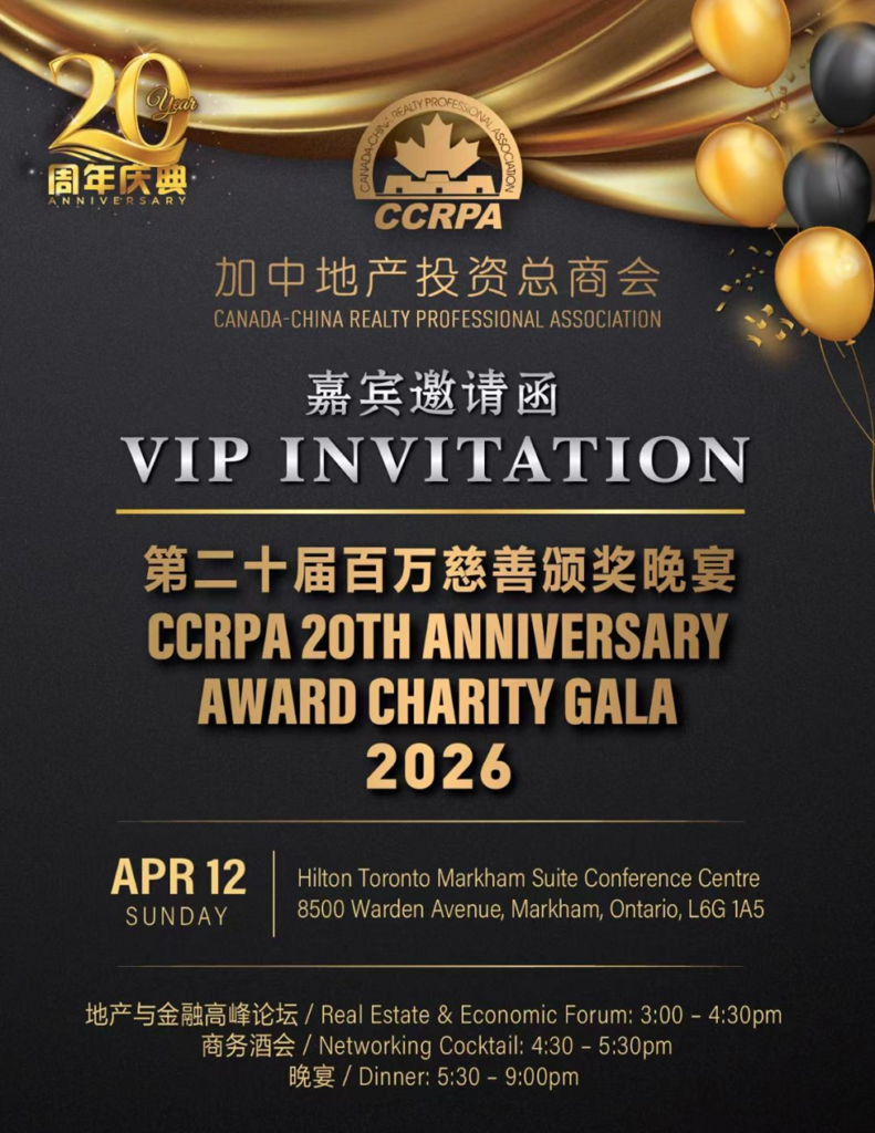 【加拿大视传媒 报道】2026年1月23日,加中地产投资总商会(CCRPA)在万锦市金瑞麟大酒店举行“CCRPA第二十届百万慈善颁奖典礼”新闻发布会。主办方表示,本届活动由中国茅台冠名赞助,并将于2026年4月12日(星期日)在万锦市 Hilton Toronto Markham Suites Conference Centre 举办地产与金融高峰论坛、商务交流酒会及颁奖慈善晚宴,晚间晚宴规模预计约1000人,慈善筹款目标为20万加元(以上规模与金额均为主办方在发布会现场公布)。