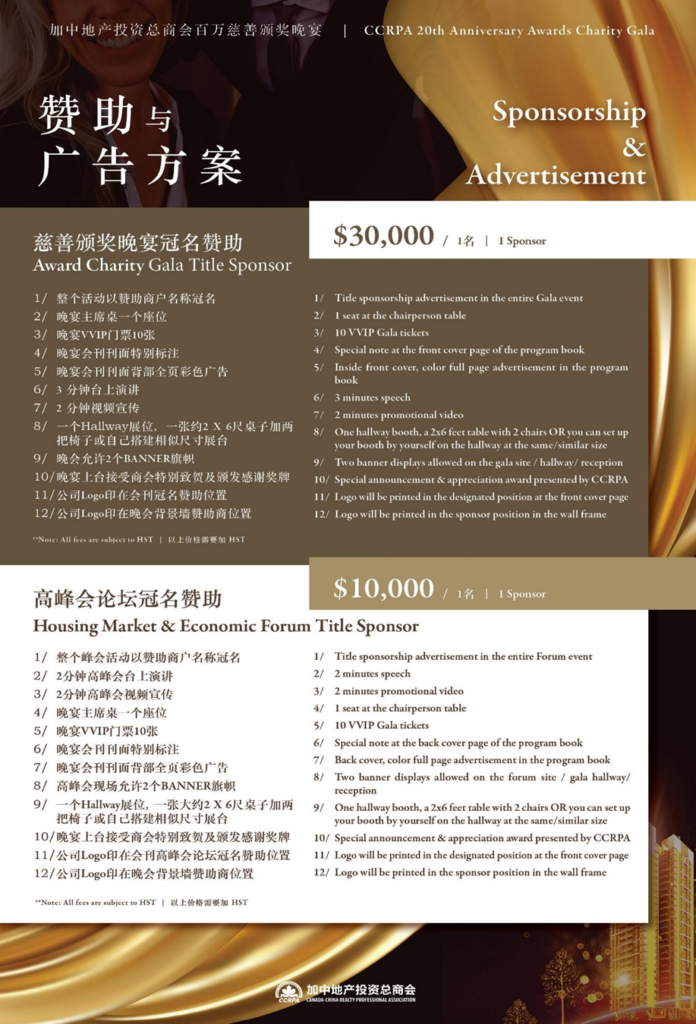 主办方同时公布咨询联系人:Henry Zhang(416-995-5553)、Samuel Wang(647-898-6567)、Martin Ding(647-869-8298)、Bruce Zhang(416-918-6162)、Angel Zhang(416-902-3347)、Dandi Zhao(416-823-6034)。付款方式为e-transfer至 Melinda Wu(ccrpa2013@gmail.com),或支票抬头“Canada-China Realty Professional Association”(以上为主办方现场公布信息)。