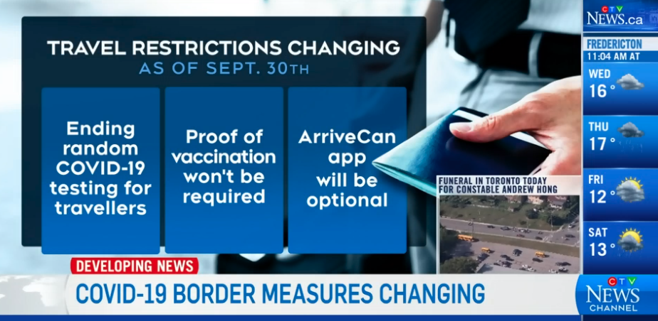 据CTV News 9月21日报道,加拿大联邦政府计划在 9月30日解除边境 COVID-19 限制,包括疫苗接种要求、随机 COVID-19 检测和使用 ArriveCan 应用程序。