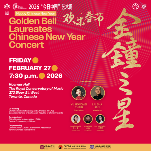 活动简述:2026年2月27日,“金钟之星”中国新年音乐会,将在多伦多皇家音乐学院科纳音乐厅精彩上演。以深度的艺术表达和高度的文化内涵,为本地民众带来迎新贺岁的节日高潮。