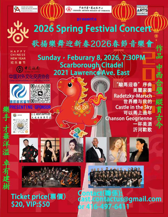 活动简述:多伦多交响乐团(Toronto Symphony Orchestra,简称 TSO)欣然宣布,将于2026年2月28日(星期六)在罗伊·汤姆森音乐厅(Roy Thomson Hall)举办一场充满活力与喜庆氛围的农历新年音乐会,以迎接马年的到来。应观众热烈要求再度回归的 《马年:农历新年庆典音乐会》,汇聚了众多杰出的特邀艺术家、深受喜爱的音乐传统以及丰富的社区庆祝活动,共同呈现一个充满新生、繁荣和欢乐团聚的夜晚。 本场音乐会将由国际知名指挥家关琦安(Carolyn Kuan)执棒,深受观众喜爱的喜剧演员大山(Dashan,本名 Mark Rowswell)将再次担任主持人和旁白。与他们同台演出的还有享誉全球的琵琶演奏家吴蛮(Wu Man),她以精湛的技艺和致力于推广琵琶而享誉世界;以及年仅15岁的钢琴神童、郎朗国际音乐基金会青年学者黄睿安(Ryan Huang),他将演奏格里格《钢琴协奏曲》第一乐章。此外,杨洋舞蹈工作室(Yang Yang Dance Studio)也将带来舞蹈表演,为音乐会增添色彩、律动与文化叙事的多重层次。中国银行(加拿大)将连续第三年赞助农历新年音乐会。(LJI by Rita)