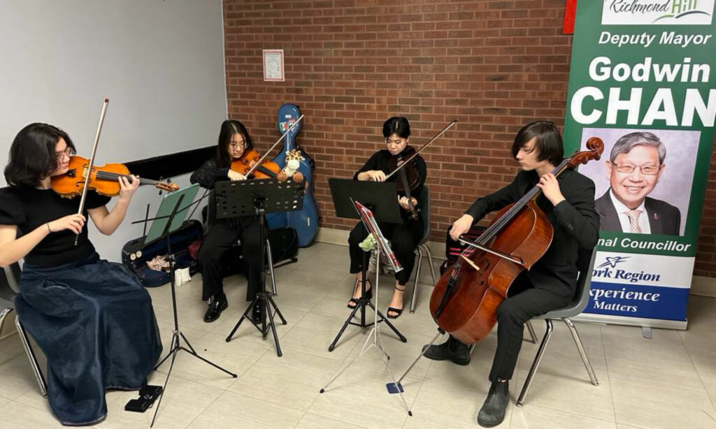 音乐扬起是加拿大小交响乐青年乐团的弦乐四重奏,别看只是一群高中生,都是具有专业水准的小音乐家,美妙的音乐吸引大家的目光,演出了许多中西名曲令人陶醉,纷纷驻足欣赏,并和小音乐家们合影。