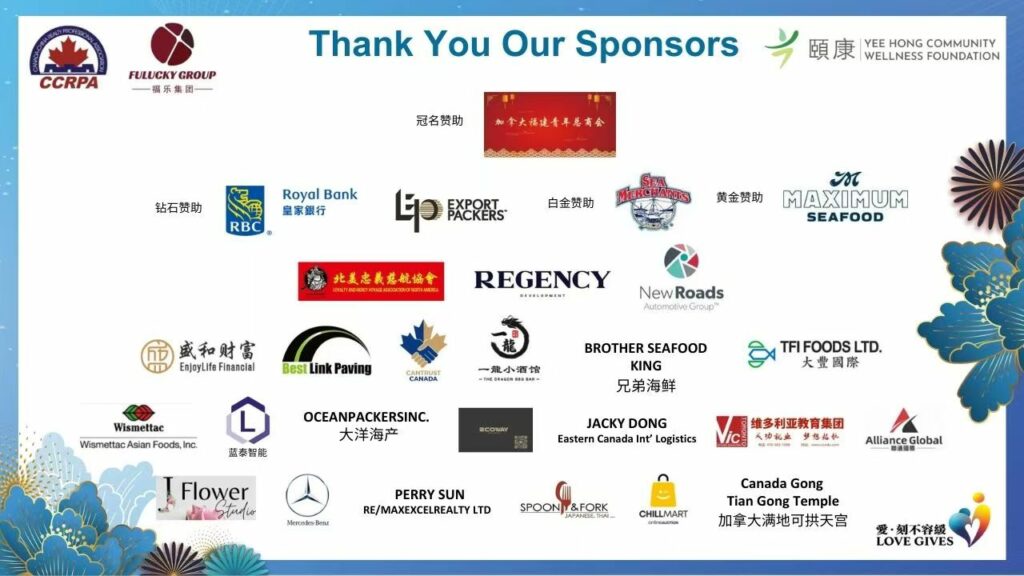 主办方介绍,本次晚宴与Yee Hong颐康基金会及CCRPA基金会合作,聚焦关爱长者项目。活动现场,颐康CCRPA百万筹款委员会主席(加中地产投资总商会会长)孙志峰、共同主席(Tridel副总裁)Winson Chan及颐康基金会总裁萧显扬介绍筹款计划与用途,多家企业与个人随后参与现场捐款。